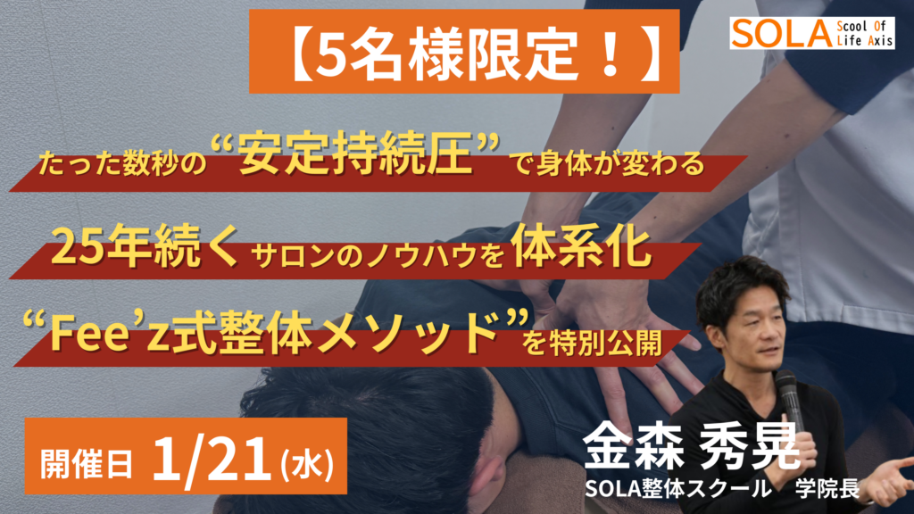 「安定して“効く指圧”が再現できるようになる技術体系を90分で手に入れる」 このセミナーでは、「感覚頼り」になりがちな指圧を、誰でも再現できる“技術体系”として整理し、その場で体感・理解していただきます。 ・なぜ効くのか … 続きを読む 特別開催!学院長金森の特別セミナー